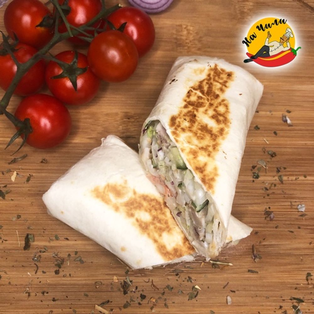 Тортилья, соус шаверма, бедро куриное, пекинская капуста, помидор, огурец свежий, огурец соленый, лук красный, морковь по-корейски.